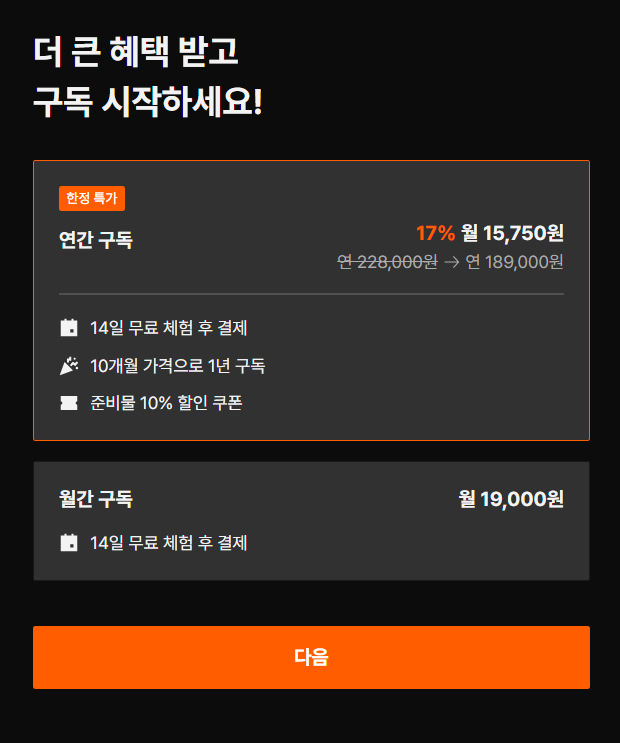 위의 사진을 보시면, 현재 12개월 구독을 했을 때 14일 무료체험이 가능하고, 월 15,750원, 즉 연189,000원에 결제가 가능한 것을 알수 있네요.